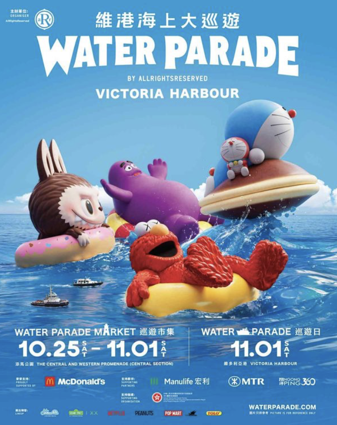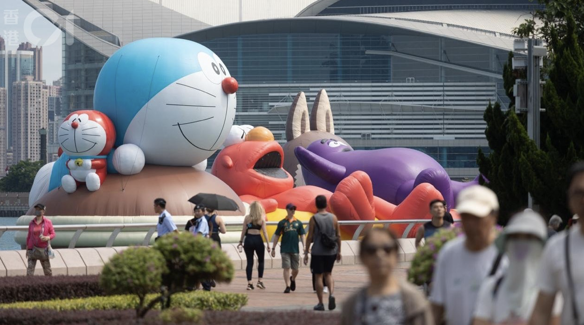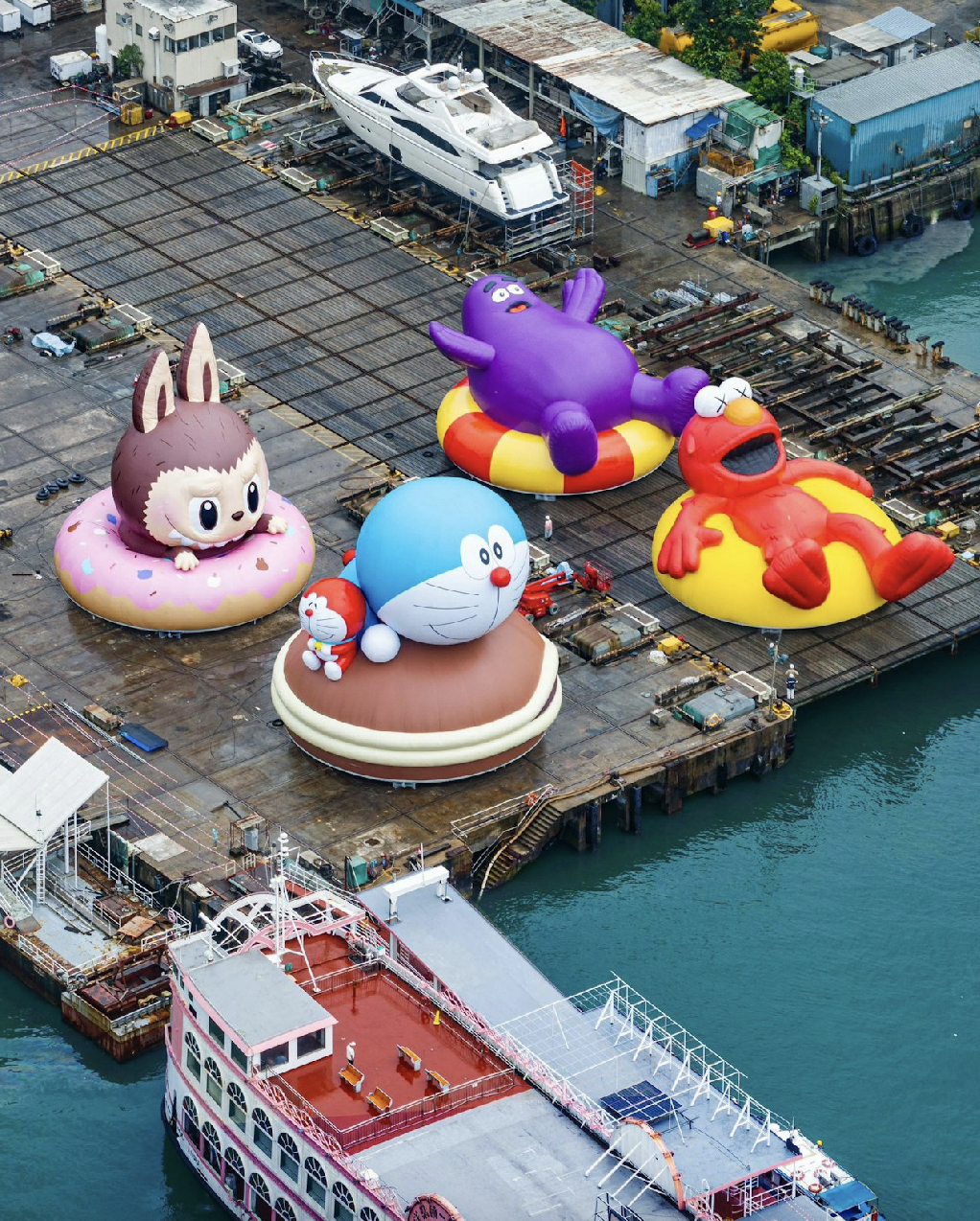 イベントの最大の見どころは、なんといっても海に浮かぶ4体の巨大インフレータブル彫刻だ。主役は香港のアーティスト、龍家昇(Kasing Lung)氏が生み出して世界で爆発的な人気を呼んだPOP MARTのアート玩具キャラクター「LABUBU(ラブブ)」、日本の国民的キャラクターで世界中で愛されている「ドラえもん」、米国の現代アーティストKAWSとコラボレーションした「セサミストリート」の人気キャラクター・エルモ、そして世界一有名なファストフードチェーン・マクドナルドのキャラクター「グリマス」で、それぞれ全長20メートルを超える彫刻がビクトリア・ハーバーに浮かぶ姿はまさに圧巻。背景の高層ビル群と調和した幻想的な光景が広がる。鑑賞は無料で、金鐘(アドミラルティ)の添馬公園や海辺の遊歩道から多くの市民や観光客が4体のキャラクターを眺め、スマートフォンで撮影したりスケッチブックに描き留めたりする姿が見られる。