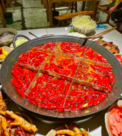 世界最大の火鍋レストラン「枇杷園」で、グツグツと沸く牛油火鍋から立ち上がる唐辛子の香りに包まれながら、牛のモツやガチョウの腸などを鍋の中で「七上八下( 箸で持ったまますばやく7回上げ8回下げしてさっと火を通す)」と、純粋な辛さにやみつきになります。